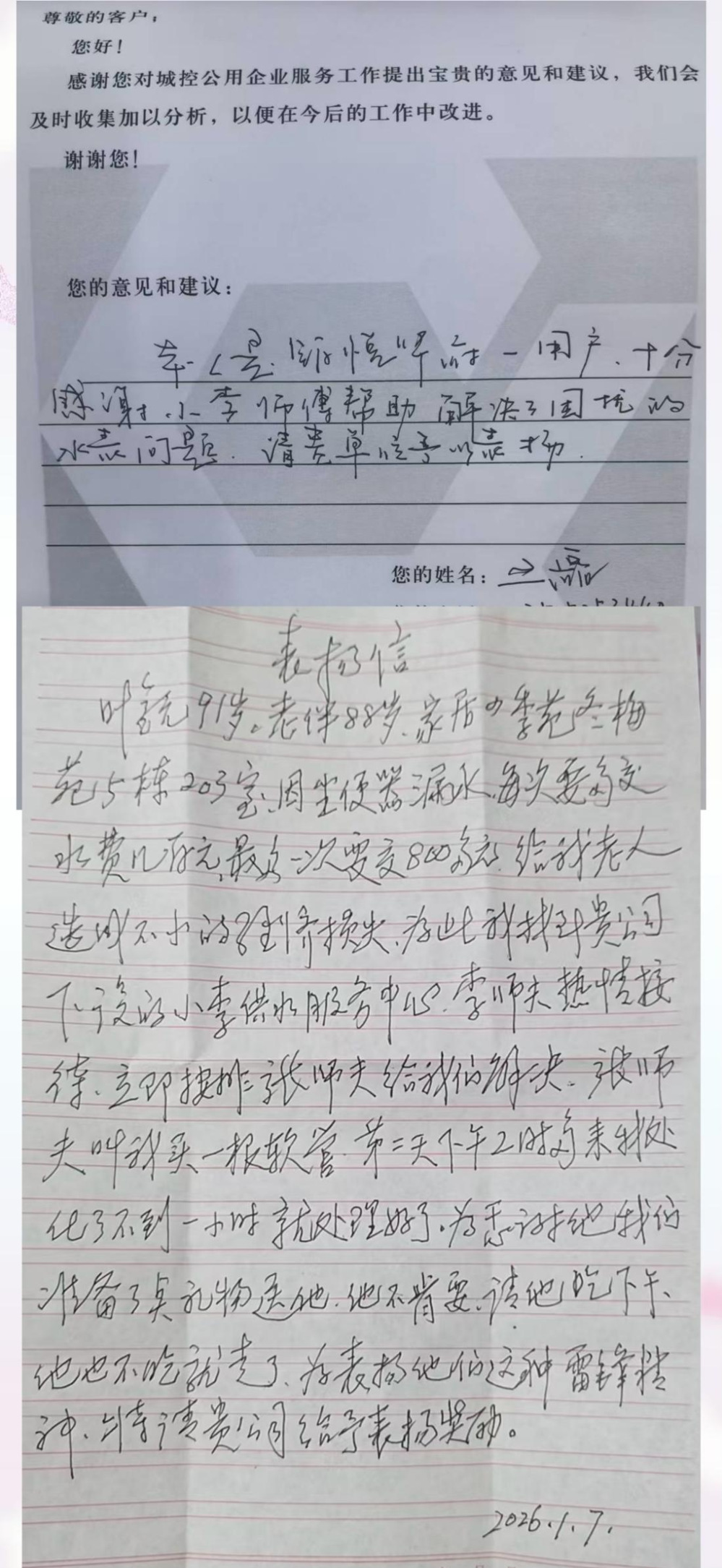 2025年12月10日下午及2026年1月7日,長江水務(wù)小李服務(wù)隊隊長李青同志及隊員,在文匯東路服務(wù)大廳先后收到兩位用戶的高度贊揚。用戶對服務(wù)隊專業(yè)高效、熱情周到的服務(wù)給予了誠摯肯定。